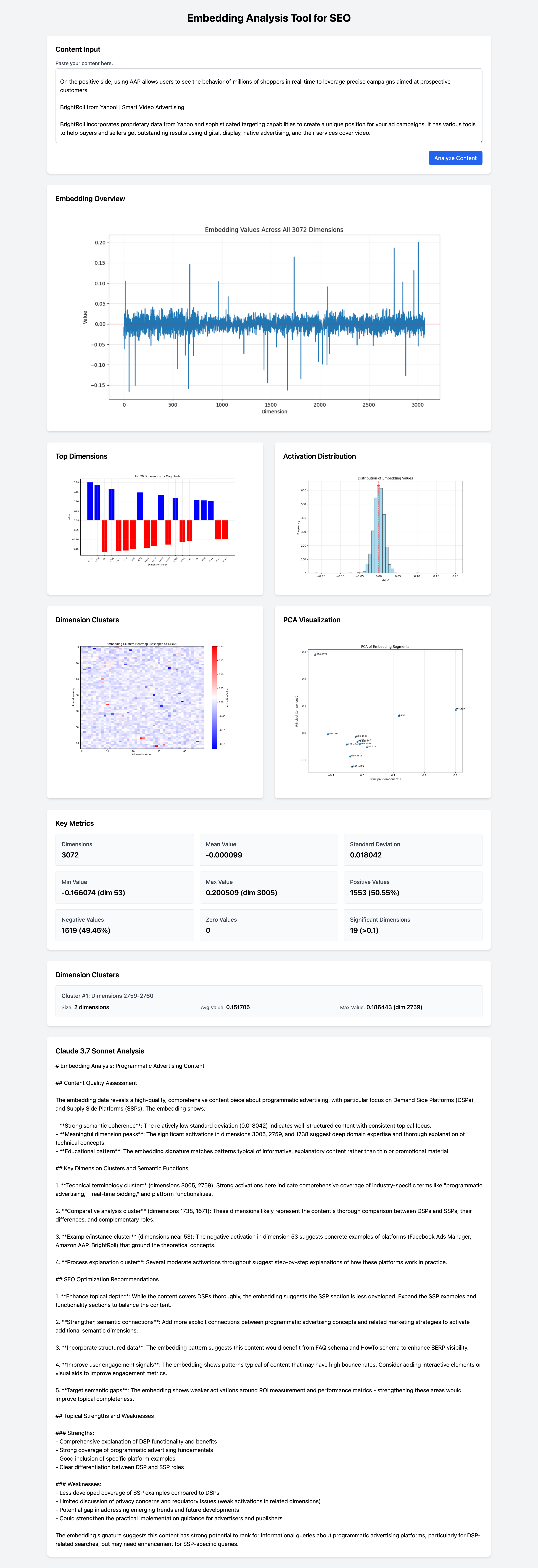 “The embedding signature suggests this content has strong potential to rank for informational queries about programmatic advertising platforms, particularly for DSP-related searches, but may need enhancement for SSP-specific queries.