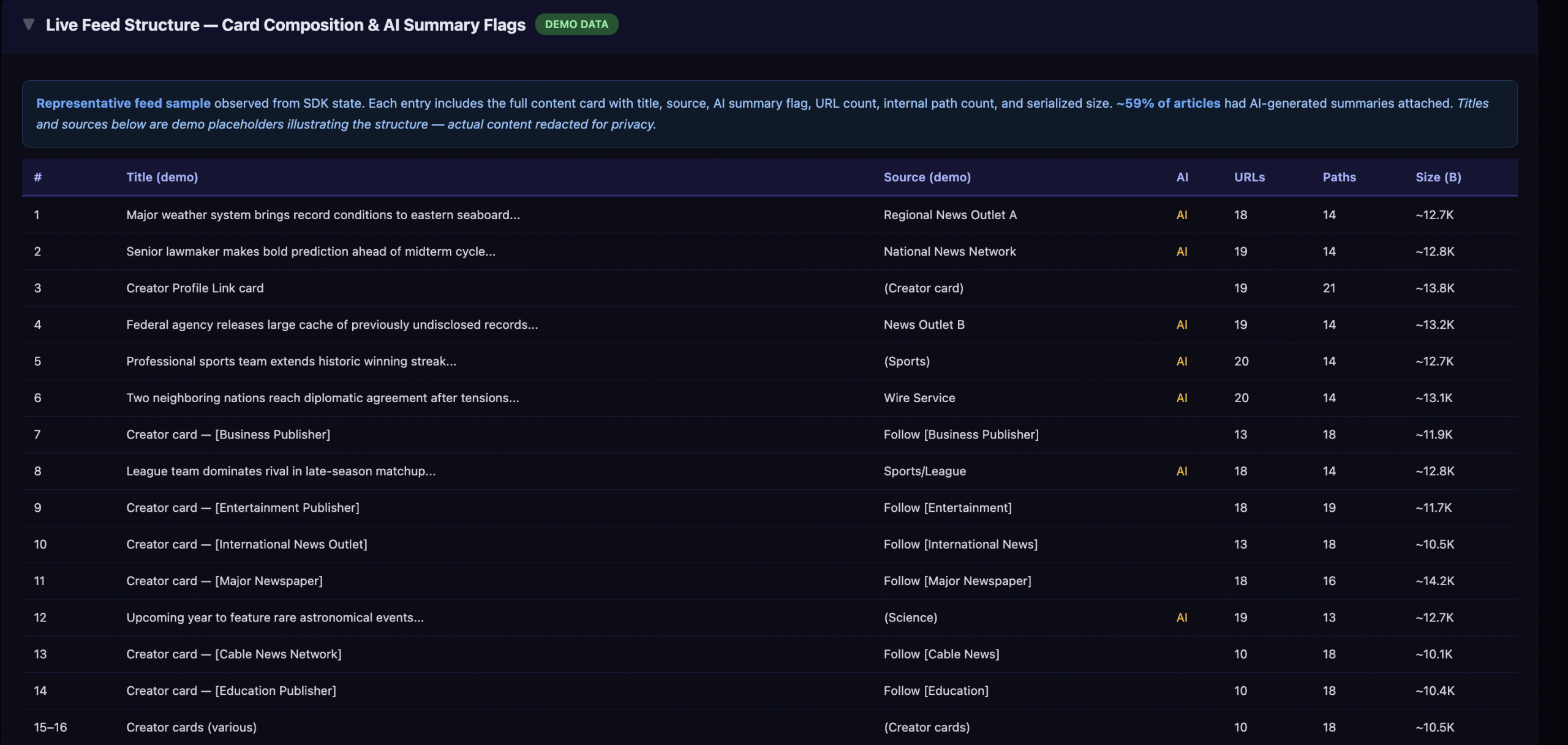 Every card in a Discover feed carries 8 internal diagnostic metadata fields beyond what users see: