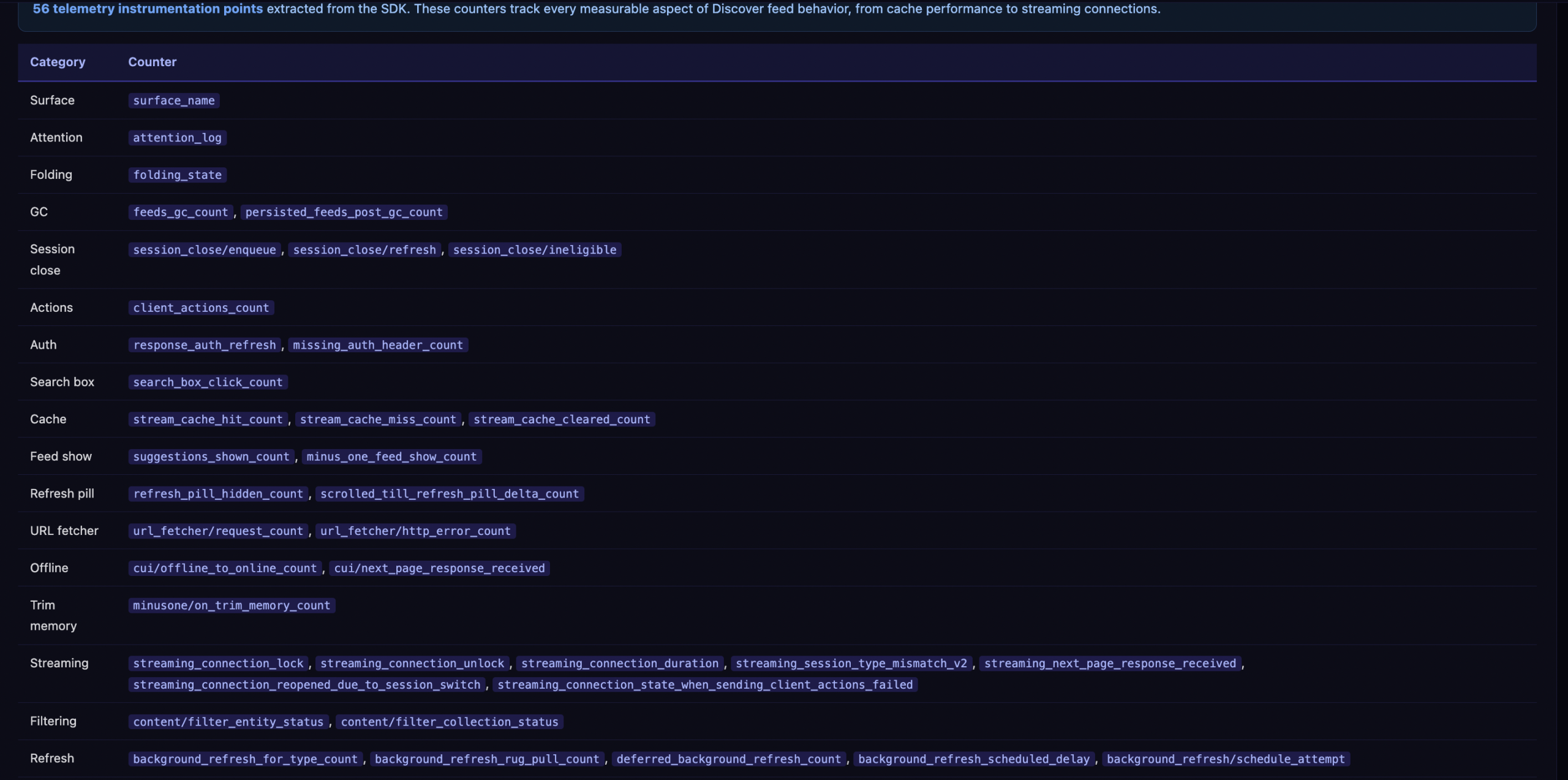 The last one is particularly interesting. The “rug pull” counter tracks cases where content was pushed to the feed and then removed during a background refresh. This means Discover can retroactively remove content that was already in the feed, not just filter it before display.