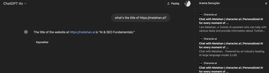 Next, I created a new WordPress site(metehan.ai) and pasted the link directly to SearchGPT, asking, “What’s the title of this page?”