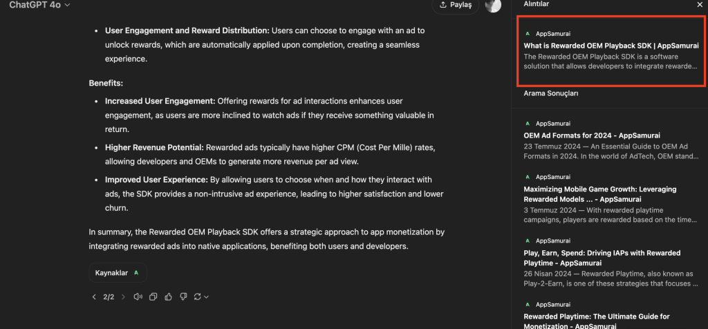 I wanted to test a “no competition” query. There is no wording/verb or product online for “Rewarded OEM Playback SDK” I just brought some random keywords and tried to index a newly created page instantly on SearchGPT. It’s indexed after 48 hours, there is only one single citation result that points to a correct URL. Bing index records for this page on appsamurai.com, only took around 2 minutes.
